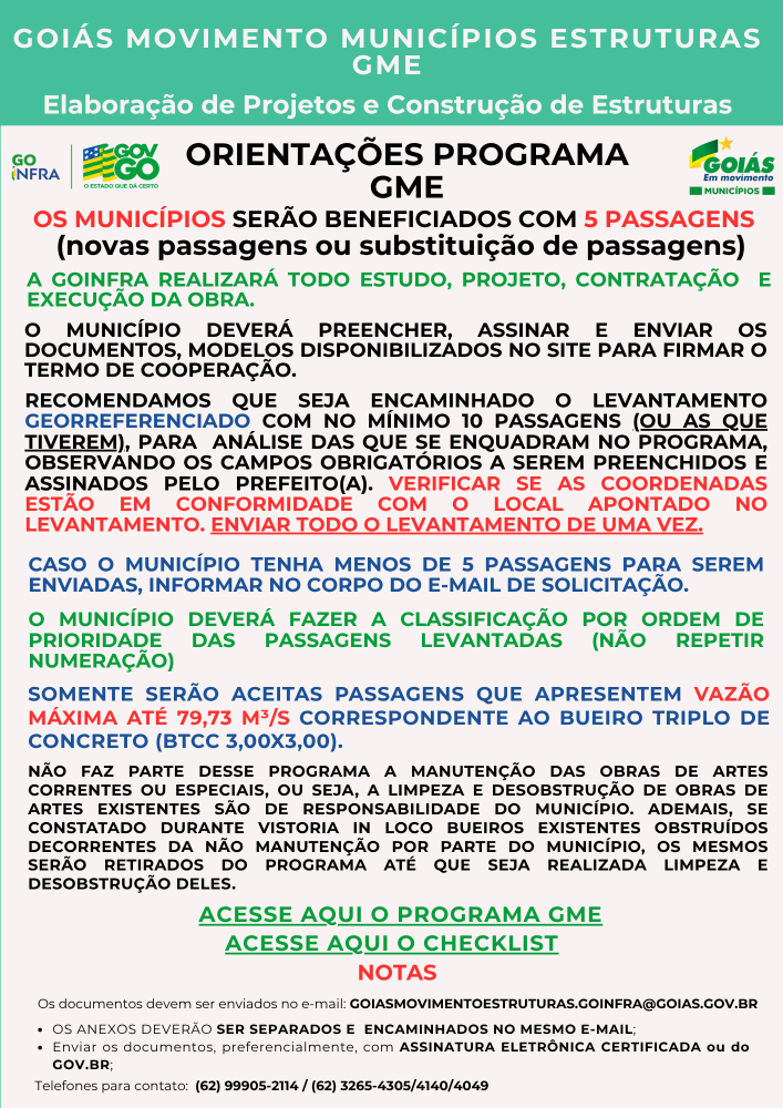 O Programa Goiás em Movimento Municípios Estruturas - GME (Elaboração de Projetos e Construção de Estruturas), promovido pela Agência Goiana de Infraestrutura e Transportes - GOINFRA, visa a elaboração de projetos e construção de estruturas (bueiros) que serão implantadas em passagens existentes ou em novas passagens para atender as demandas das estradas vicinais dos municípios do estado de Goiás.