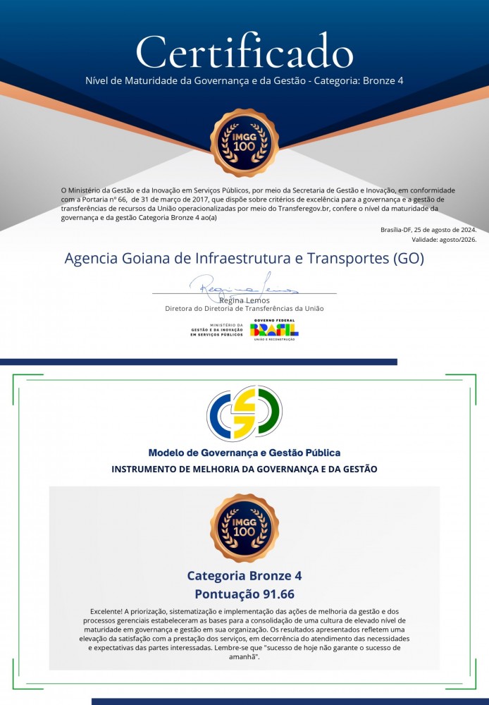 A Goinfra alcançou nível elevado em maturidade de governança e gestão, conquistando lugar na Categoria Bronze 4. A certificação é concedida pelo Ministério da Gestão e da Inovação em Serviços Públicos e o resultado alcançado pela Agência reflete o comprometimento com a excelência e a transparência na administração pública.