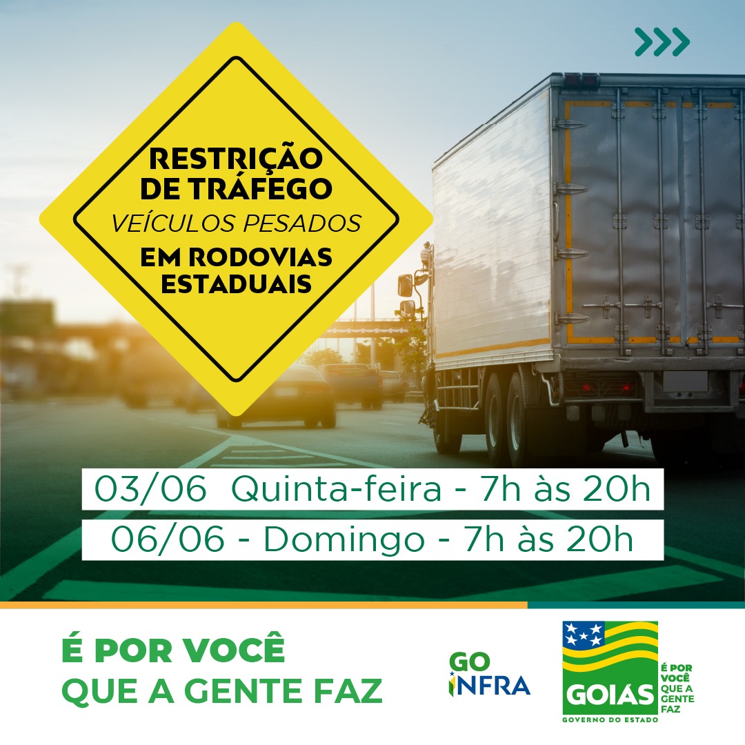 A Agência Goiana de Infraestrutura e Transportes (Goinfra) informa que haverá restrição na circulação de veículos pesados no tráfego pelas rodovias estaduais de pista simples e com duplo sentido durante o feriado de Corpus Christi.