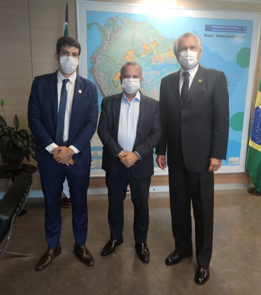 O governador Ronaldo Caiado e o presidente da Agência Goiana de Infraestrutura e Transportes (Goinfra), Pedro Sales, estiveram nesta terça-feira (20/10), em Brasília, reunidos com o ministro do Desenvolvimento Regional, Rogério Marinho.