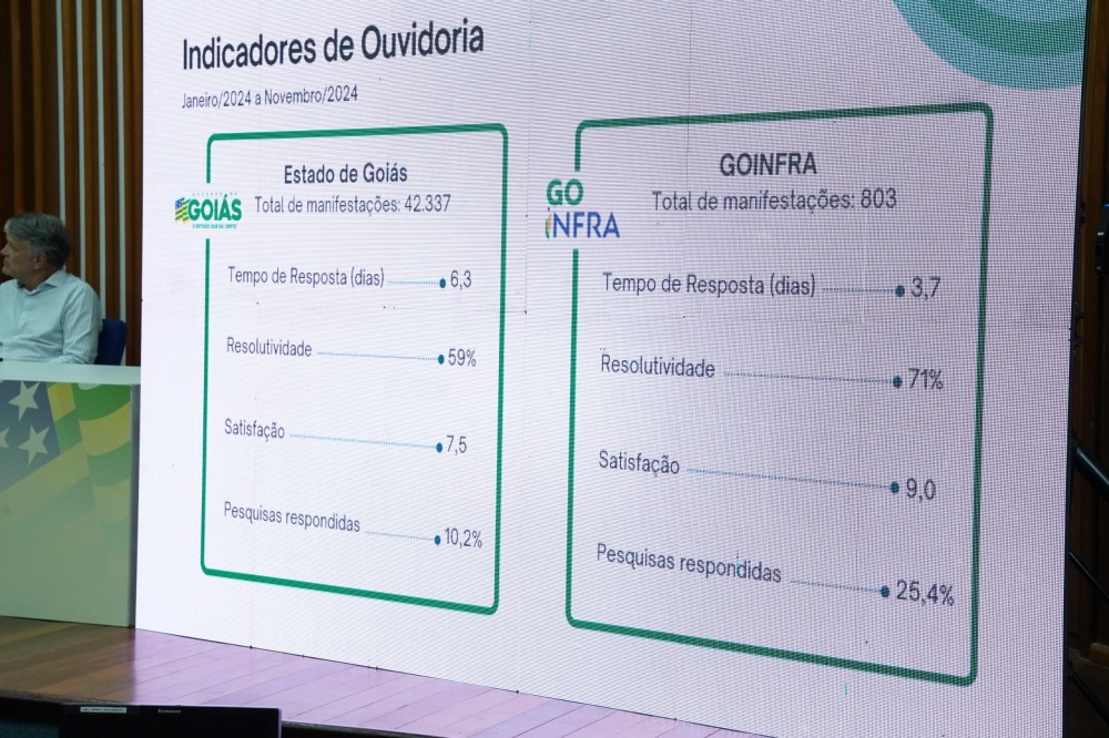 Indicadores obtidos pela Ouvidoria da Agência Goiana de Infraestrutura e Transportes (Goinfra) apontam eficiência e agilidade como atributos da autarquia na resolução de demandas apresentadas pelo cidadão. O documento foi apresentado durante o 1° Encontro de Ouvidoria da Goinfra, nesta terça-feira (3/12). Entre os destaques de 2024, agência alcançou nota 9 de satisfação no atendimento e índice de 71% de pleitos respondidos. Conforme evidencia o presidente Pedro Sales, os resultados são reflexos de um serviço de alta qualidade e reforçam um movimento de mudança cultural e de posicionamento no relacionamento do Poder Público com a sociedade.